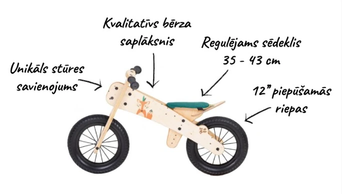 Tas ir izgatavots no augstas kvalitātes bērza saplākšņa, kas ir gan izturīgs, gan dabai draudzīgs materiāls. Virsma apstrādāta ar dabīgu linsēklu eļļu, kas nodrošina koksnes ilgmūžību, vienlaikus saglabājot to drošu bērna veselībai – bez kaitīgām ķīmiskām vielām. Šis skrejritenītis ir ne tikai rotaļlieta, bet arī ilgtspējīgs ieguldījums Jūsu bērna attīstībā.