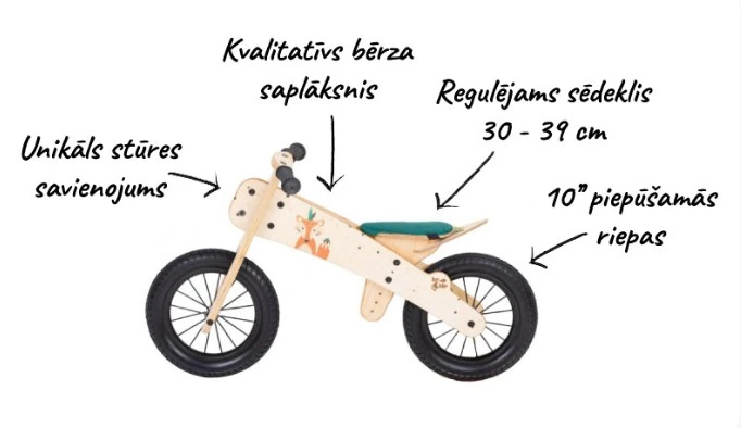 Tas ir izgatavots no augstas kvalitātes bērza saplākšņa, kas ir gan izturīgs, gan dabai draudzīgs materiāls. Virsma apstrādāta ar dabīgu linsēklu eļļu, kas nodrošina koksnes ilgmūžību, vienlaikus saglabājot to drošu bērna veselībai – bez kaitīgām ķīmiskām vielām. Šis skrejritenītis ir ne tikai rotaļlieta, bet arī ilgtspējīgs ieguldījums Jūsu bērna attīstībā.