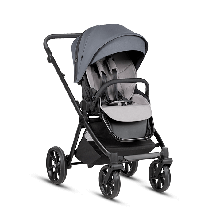 bērnu ratus ar drošu kulbu, ērtu sēžamo daļu un vienmērīgu gaitu dažādos ceļa apstākļos.