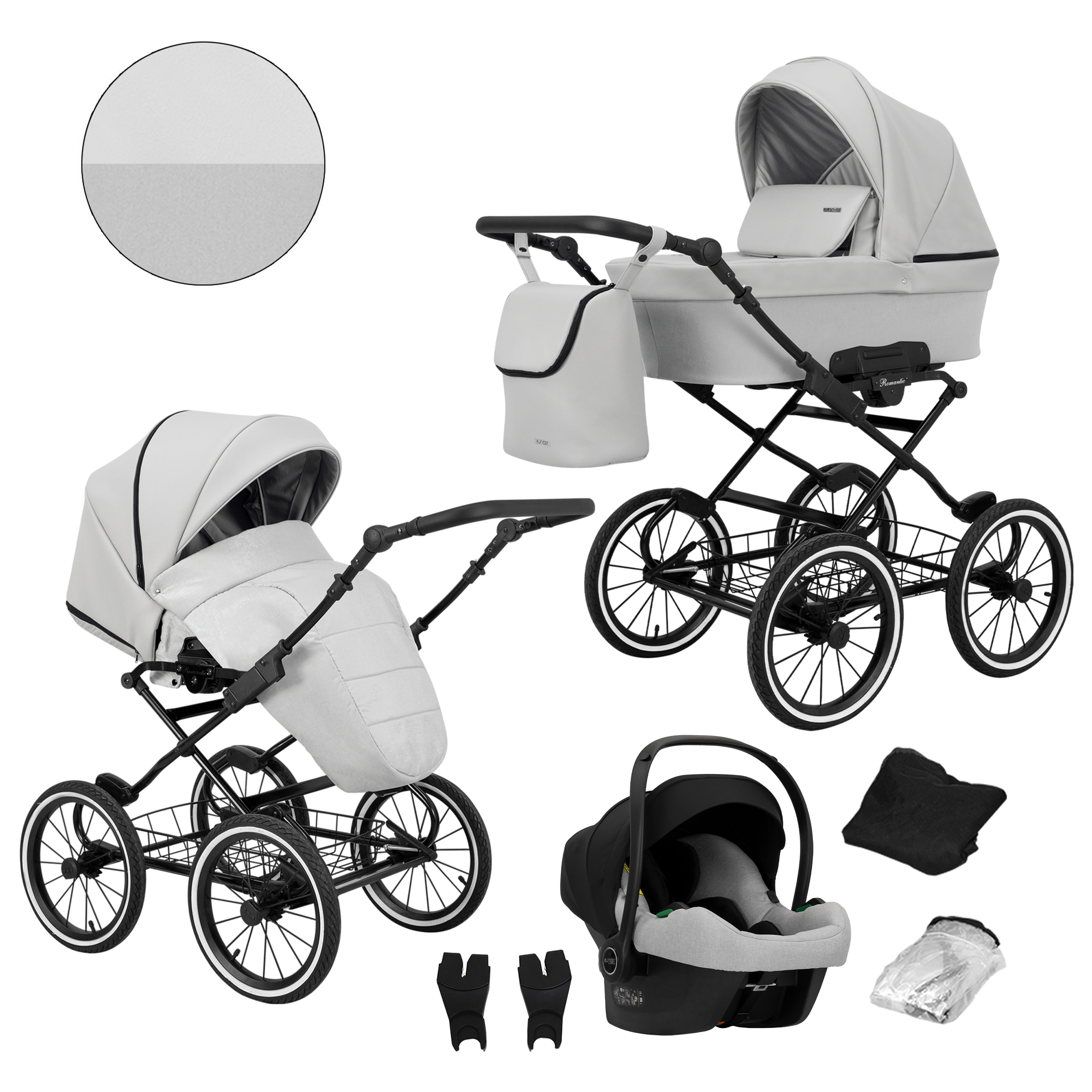 Komplektā ar Klasiskiem bērnu ratiem 3in1 Romantic ietilpst viss, kas nepieciešams pilnvērtīgai lietošanai jau no mazuļa dzimšanas līdz brīdim, kad viņš sāk patstāvīgi staigāt. Šeit ir detalizēts komplekta apraksts: