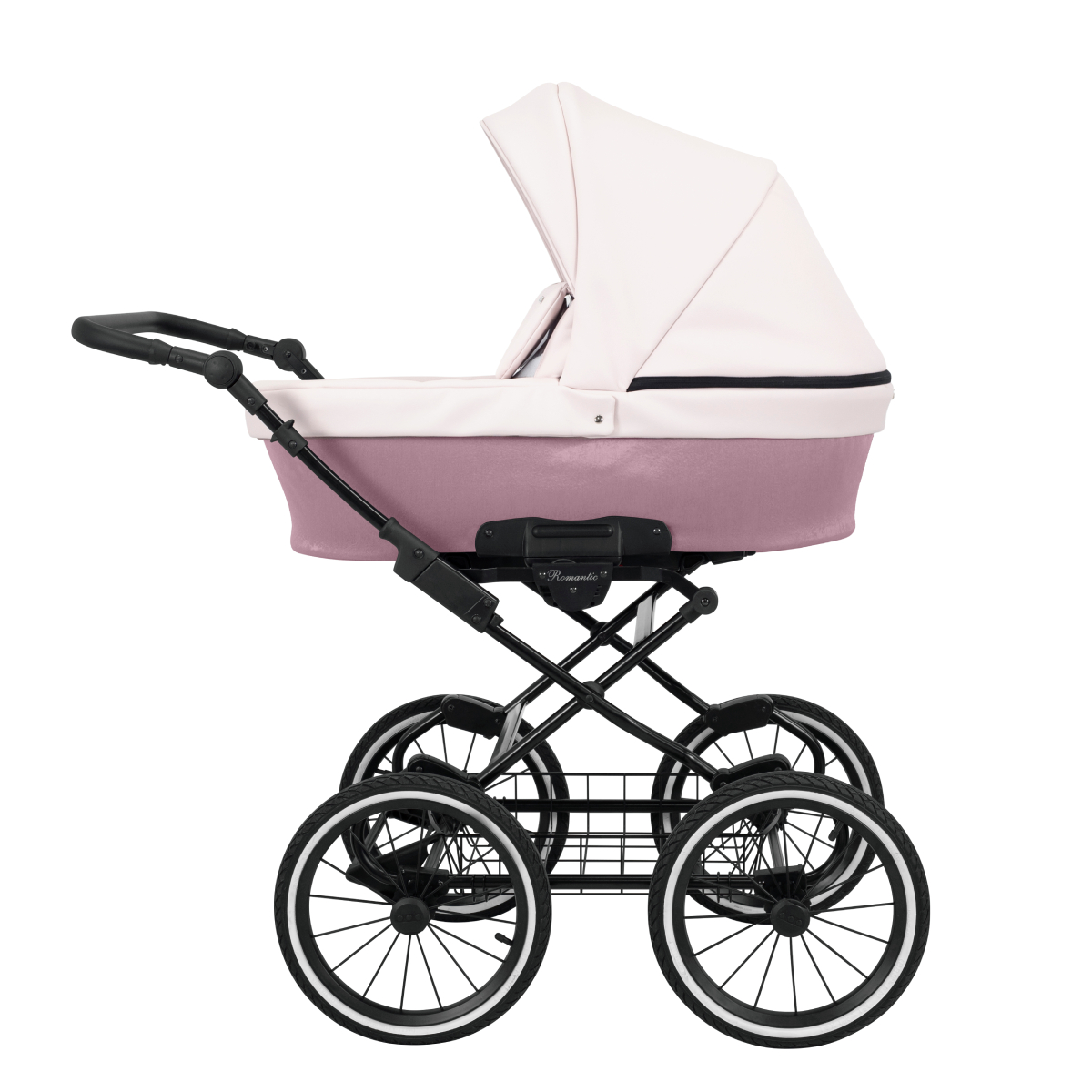 Romantic sērijas bērnu rati izceļas ar klasisku, bet vienlaikus elegantu dizainu, kas radīts, lai piesaistītu uzmanību. Pieejamās krāsu kombinācijas un izsmalcinātie apdares materiāli ir piemēroti tiem, kas novērtē gan vizuālo estētiku, gan praktiskumu. Šo ratu izturīgais tērauda rāmis ir ne tikai elegants, bet arī nodrošina stabilitāti un ilgu kalpošanas laiku. Ādas imitācijas detaļas piešķir šiem ratiem izsmalcinātību, turklāt tās ir viegli tīrāmas un izturīgas pret nolietošanos.