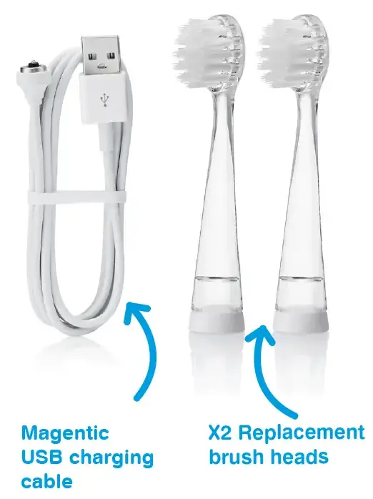 Komplektā iekļautas 2 nomaināmas suku galviņas un piesūcekņa pamatne, kas ļauj zobu birsti ērti novietot jebkurā virsmā.
