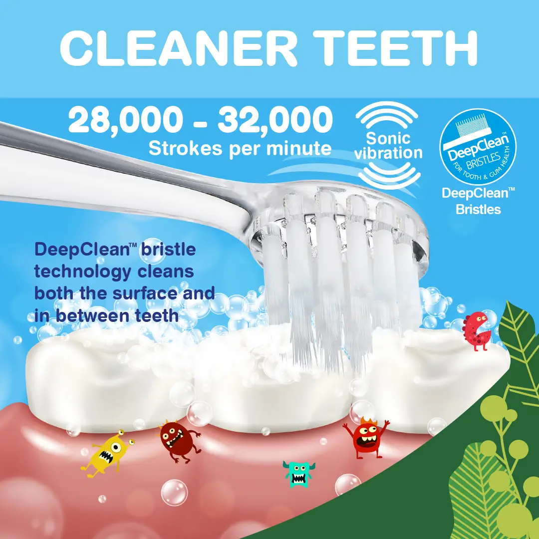 DEEP CLEAN sariņu tehnoloģija nodrošina dziļu un saudzīgu zobu tīrīšanu, vienlaikus saudzējot smaganas. Divi tīrīšanas režīmi (28 000–32 000 vibrāciju minūtē) ļauj pielāgot intensitāti dažāda vecuma bērniem.