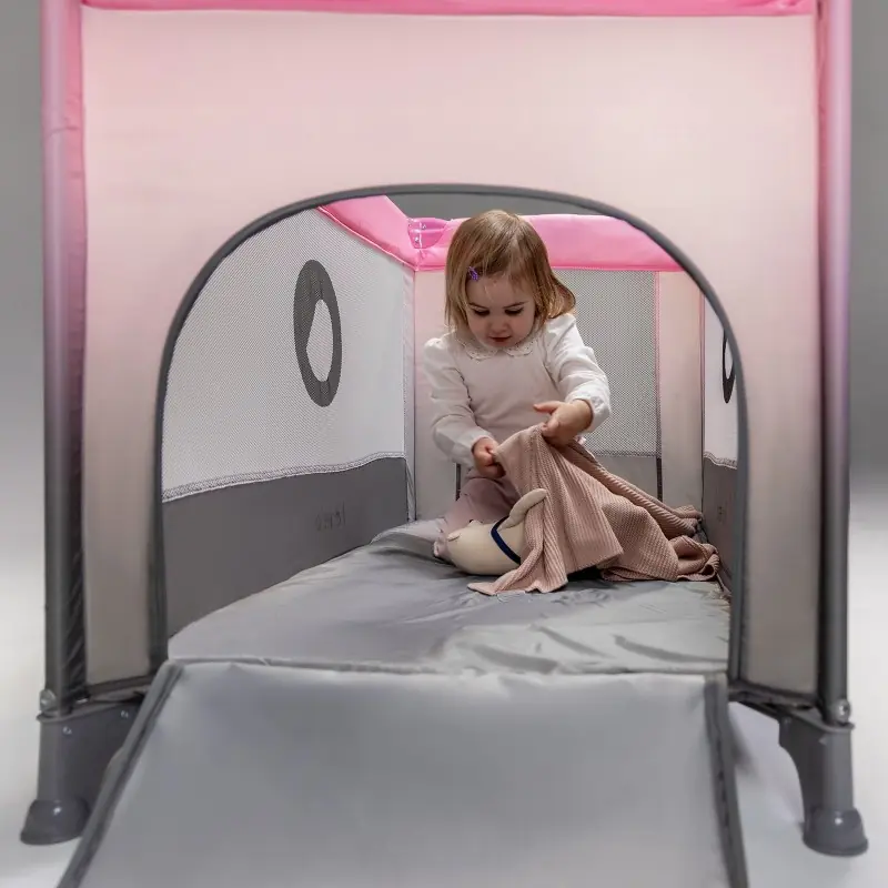 Kompakta un viegli saliekama konstrukcija – pateicoties praktiskajai salikšanas sistēmai, gultiņu var ērti salocīt līdz kompaktiem izmēriem 77 x 21 x 20 cm, kas ievērojami atvieglo tās glabāšanu un transportēšanu. Gultiņa ir lieliski piemērota ģimenēm, kas bieži ceļo, jo pārnēsāšanas soma komplektā ļauj to ērti paņemt līdzi ceļā – gan automašīnā, gan sabiedriskajā transportā.