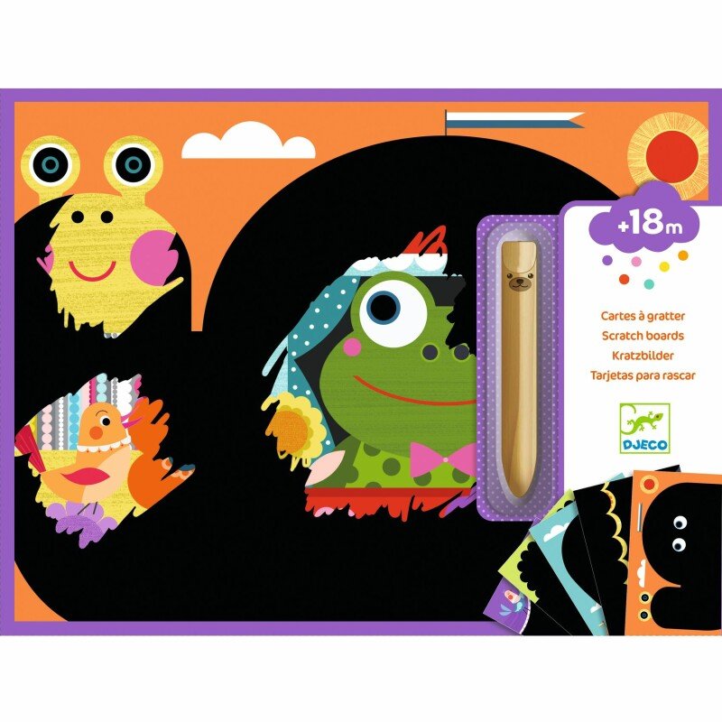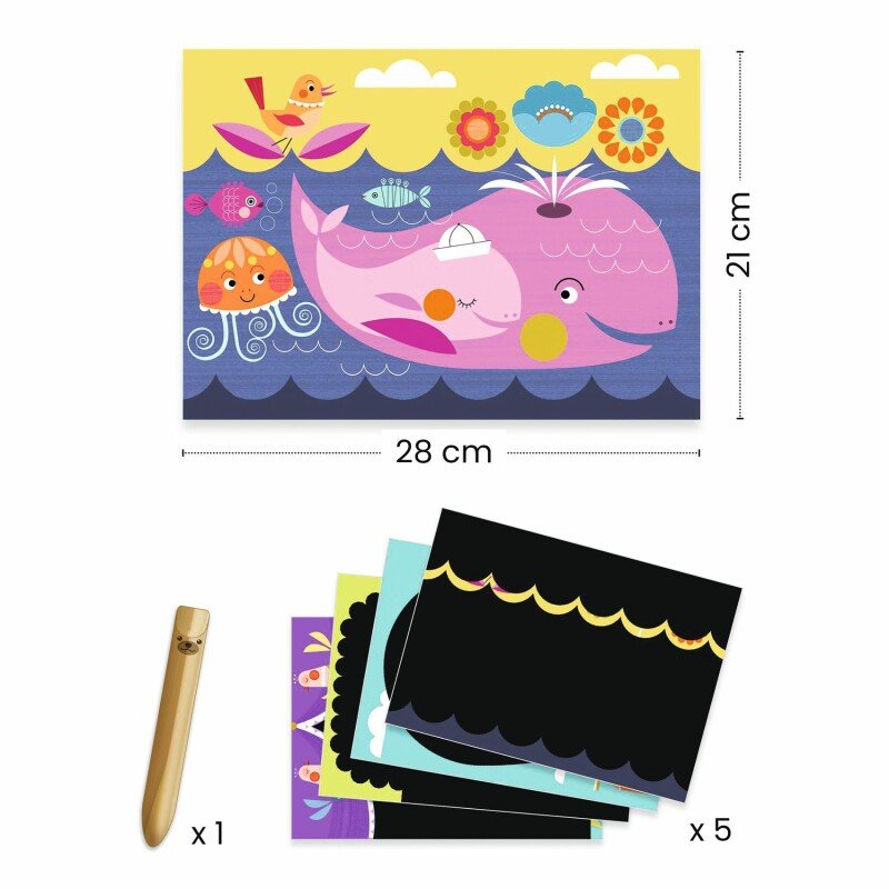 Djeco Skrāpējamās kartiņas – Jautrie atklājumi piedāvā bērniem īpašu radošo nodarbi – nokasot kartiņas virskārtu,