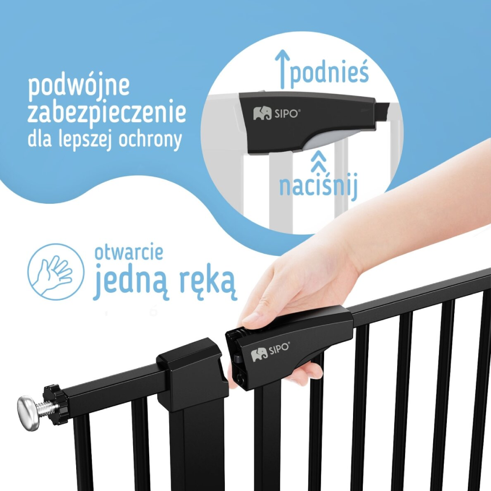 Drošības vārtiņi bērniem SIPO Black ir lieliska izvēle vecākiem, kuri vēlas apvienot drošību, vienkāršu uzstādīšanu un modernu dizainu. Tie nodrošina uzticamu aizsardzību un komfortu ikdienas lietošanā.