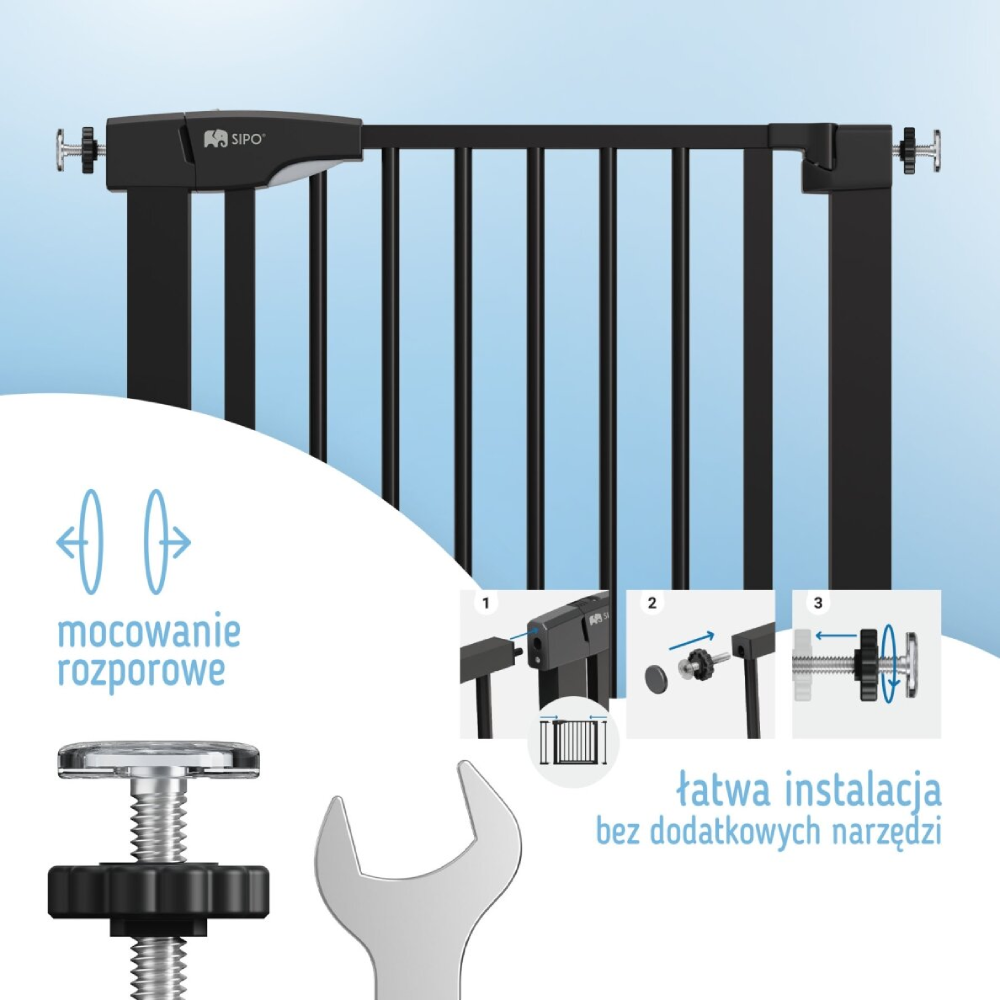Drošības vārtiņi bērniem SIPO Black nodrošina drošu vidi mājās. Viegli uzstādāmi bez urbšanas, piemēroti kāpnēm, durvīm un ikdienas lietošanai. Tie piemēroti durvju ailēm un pārejām ar platumu no 75 līdz 103 cm.