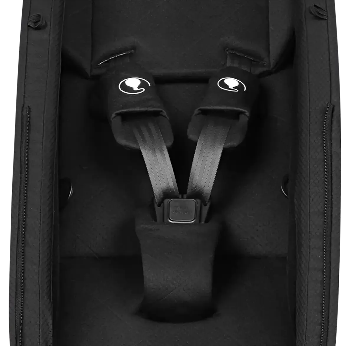 Regulējamā piecu punktu drošības josta ar polsterētām plecu siksnām ļauj pielāgoties bērna augumam un kustībām, nodrošinot drošu un ērtu pozīciju katrā pastaigā. Vējjakas funkcija ar rāvējslēdzēju pasargā no nelabvēlīgiem laikapstākļiem un ir ērti noņemama siltākās dienās.