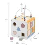 Komplektā iekļauts: figūru šķirotājs, ksilofons, kustīgi attēlu klucīši, koka pērlīšu labirints u. c. Koka pērlīšu labirintu var noņemt no kuba, lai izveidotu divas atsevišķas rotaļlietas.