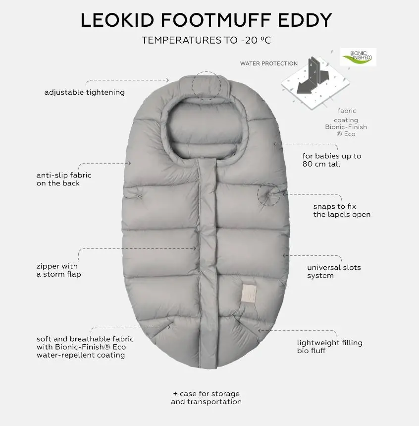 LeoKid Eddy ir veidots kā silts guļammaiss ratiem, kuram piemīt augstākā kvalitāte un izsmalcināts dizains. Šis guļammaiss bērnu ratiem ne tikai aizsargā bērnu no aukstuma, bet arī nodrošina elpojošu vidi, lai izvairītos no svīšanas un diskomforta. Eddy ir universāls, piemērots dažādiem ratu modeļiem, tāpēc to viegli pielāgot jebkurai situācijai. Vecāki, kuri vēlas praktisku un ērtu risinājumu, novērtēs šī guļammaisa elastību un spēju pielāgoties dažādām vajadzībām un laikapstākļiem.