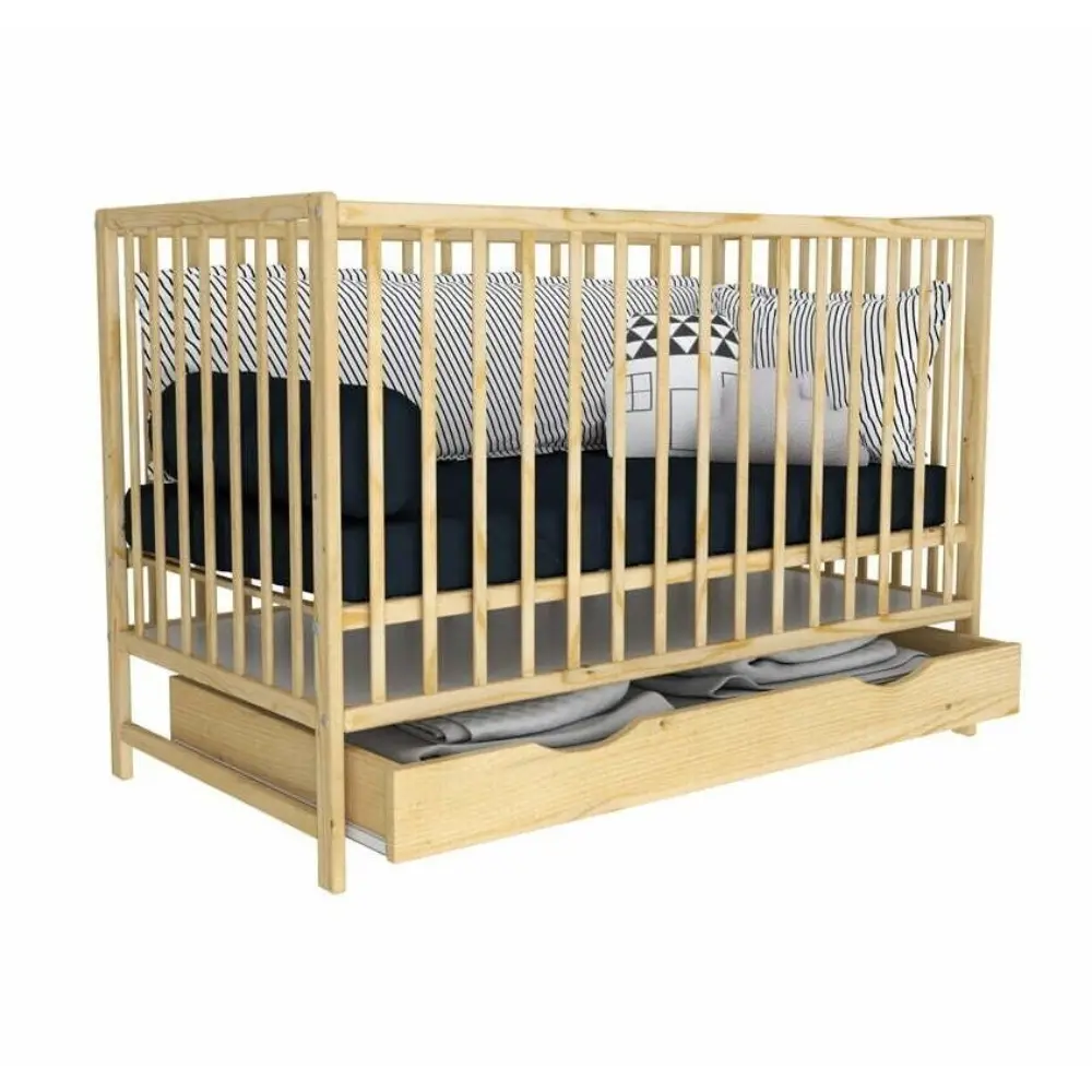 Bērnu gultiņa Magda ar atvilktni priede – eleganta un praktiska mazuļu gultiņa ar regulējamu matrača augstumu, izņemamām redelītēm un ietilpīgu atvilktni. Izgatavota no dabīga koka, piemērota bērnistabai no pirmajām dzīves dienām.