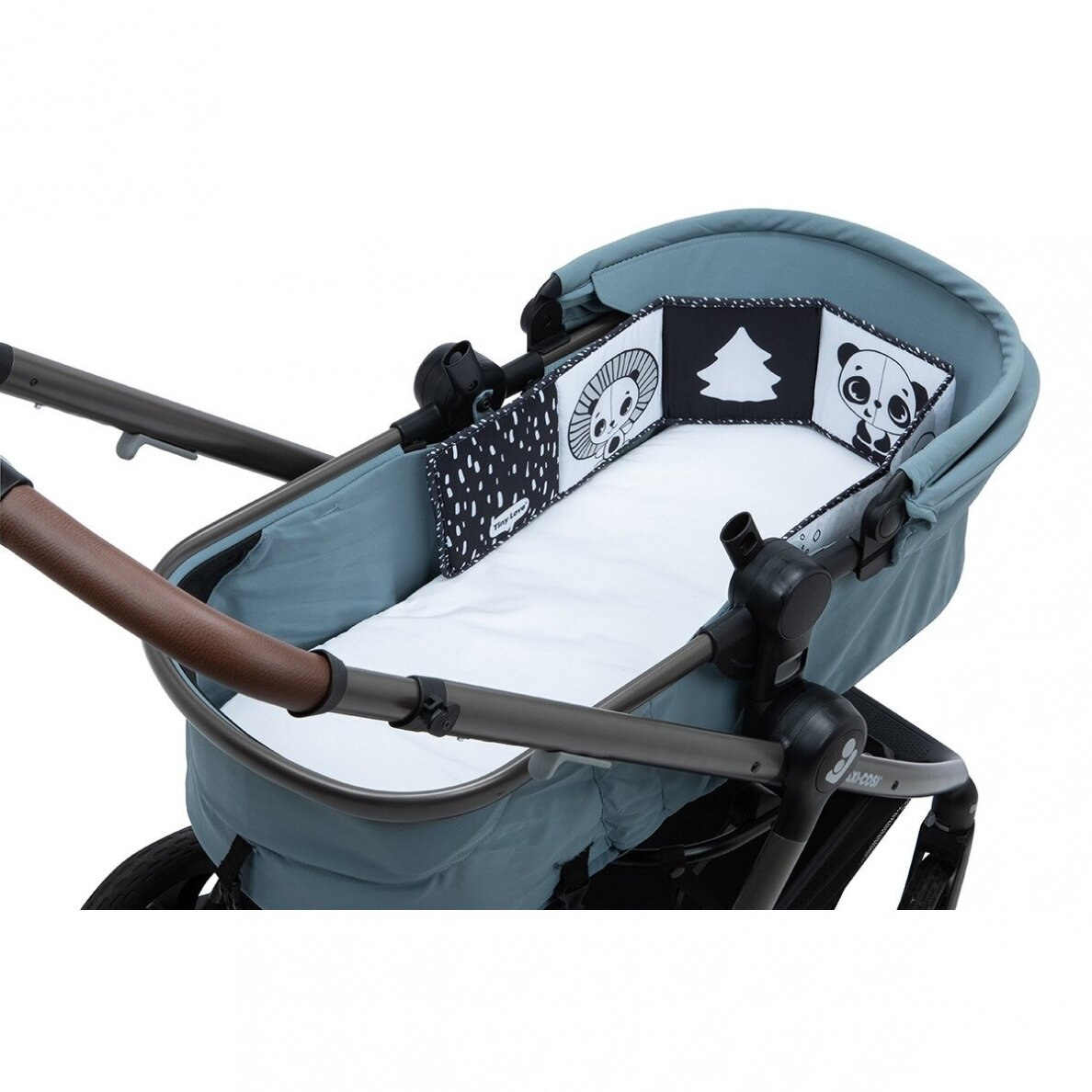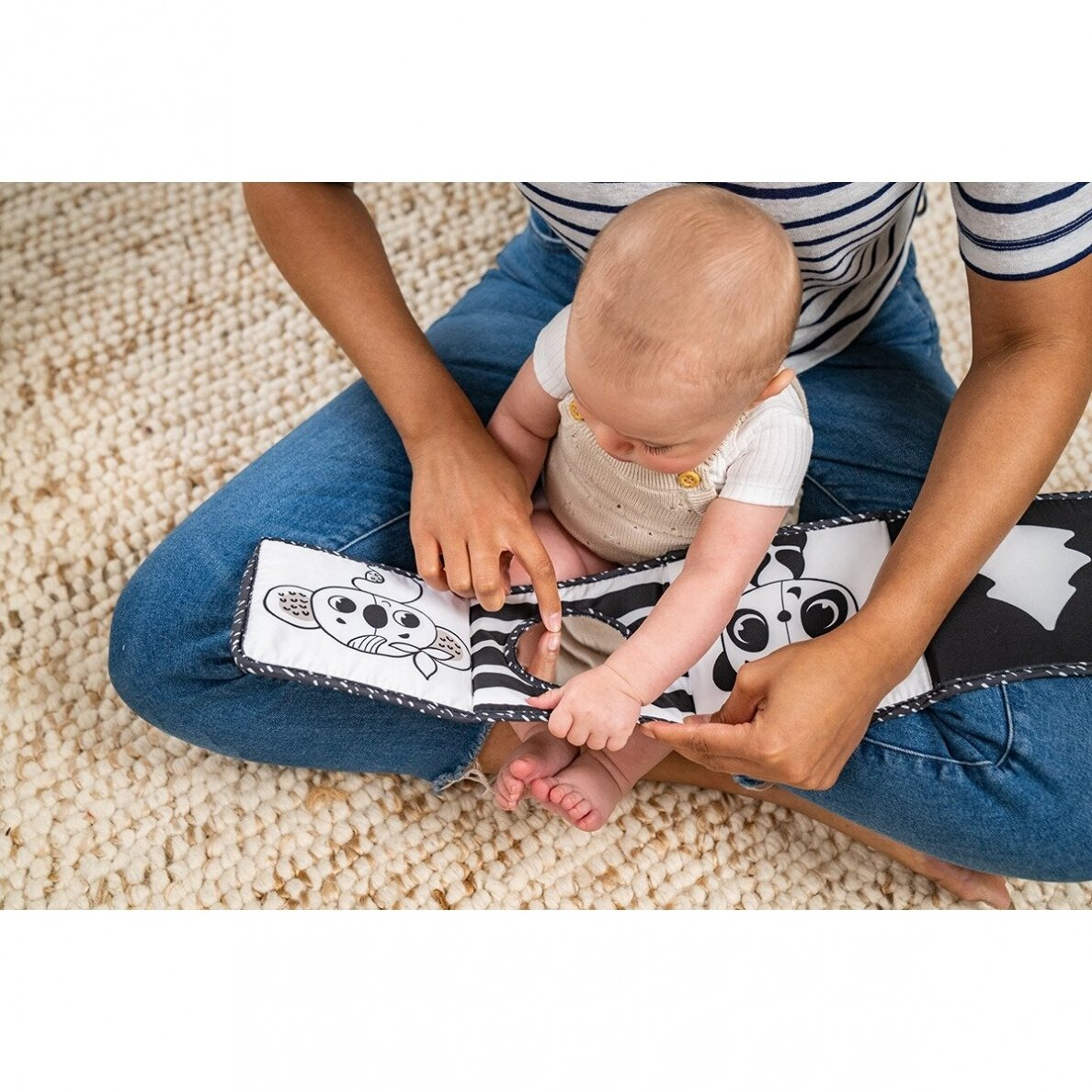 Vienā pusē ir kontrastējošs melnbalts dizains, kas stimulē redzi jau no dzimšanas, savukārt otrā pusē – maigi krāsaini attēli un mīļi tēli vecākiem mazuļiem.