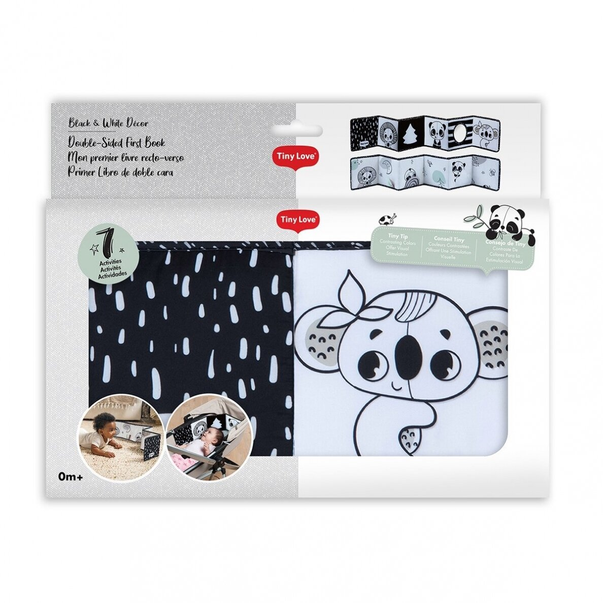 Tiny Love melnbaltā divpusējā pirmā grāmatiņa ir izstrādāta, lai atbalstītu mazuļa attīstību dažādos vecuma posmos.