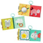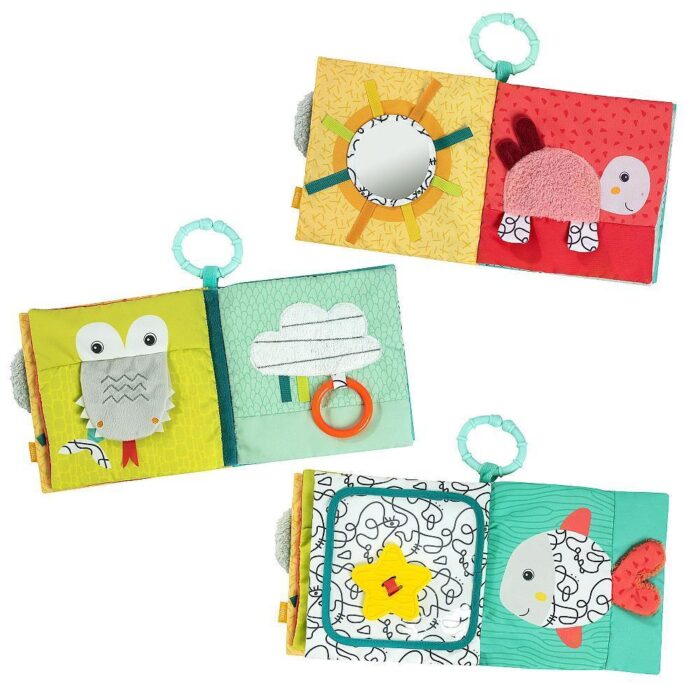 Grāmatiņa mazuļiem no auduma ar dzīvnieku motīviem: čaukstoša grāmatiņa, kuru var aptaustīt, satvert un apbrīnot – piestiprināšanai pie bērnu ratiņiem un autokrēsliņiem, piemērota zīdaiņiem un maziem bērniem no 3+ mēnešiem.