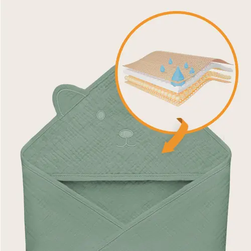 Kapuce ar izšūtu dzīvnieciņu papildus sargā no caurvēja un palīdz izveidot pozitīvas asociācijas ar ikdienas peldēšanos. Tā patīkami aptver mazuļa galviņu, uzturot siltumu un komfortu.
