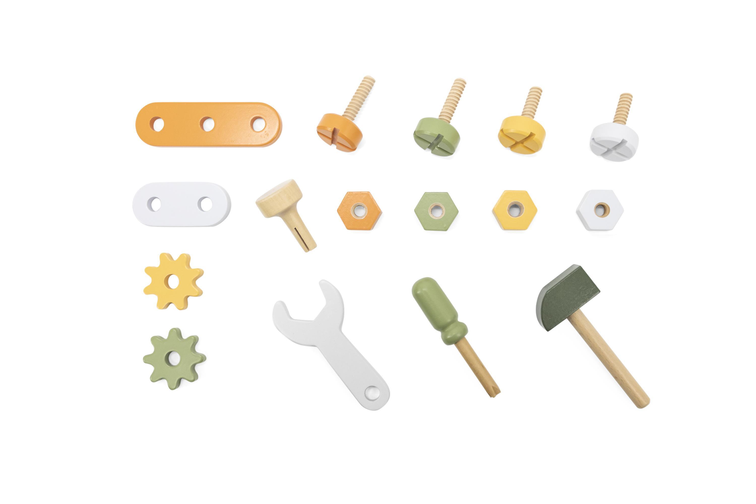 Komplektā iekļauti visi nepieciešamie elementi, lai bērns varētu skrūvēt, sist, saskaņot un eksperimentēt.