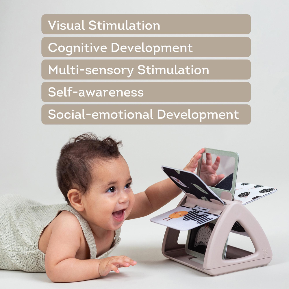 Bērns var griezt lapas, klausīties grabēšanu, skatīties spogulī un pētīt hologramas efektu, kas būtiski veicina roku–acu koordināciju.