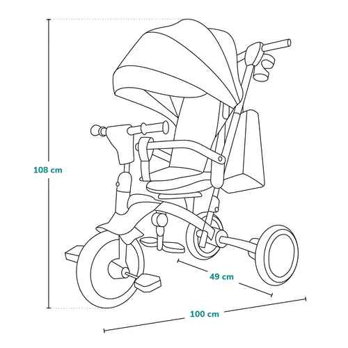 Montāža ir īpaši vienkārša – viss notiek ar vienu klikšķi, bez instrumentu nepieciešamības. Produkta kompaktie izmēri saliktā veidā padara to par ērtu sabiedroto ikdienas gaitās. Regulējamais rokturis (80–100 cm) pielāgojas dažādiem vecāku augumiem, nodrošinot komfortu ilgākos izbraucienos.