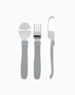 Twistshake metāla galda piederumu komplekts bērniem no 12 mēnešu vecuma ir ideāla izvēle mazuļiem, kuri sāk ēst patstāvīgi. Šis trīsdaļīgais komplekts ietver karoti, dakšiņu un nazi, kas izgatavoti no izturīga nerūsējošā tērauda un papildināti ar ergonomiskiem, mīksta materiāla rokturiem, kas nodrošina stabilu un ērtu satvērienu.